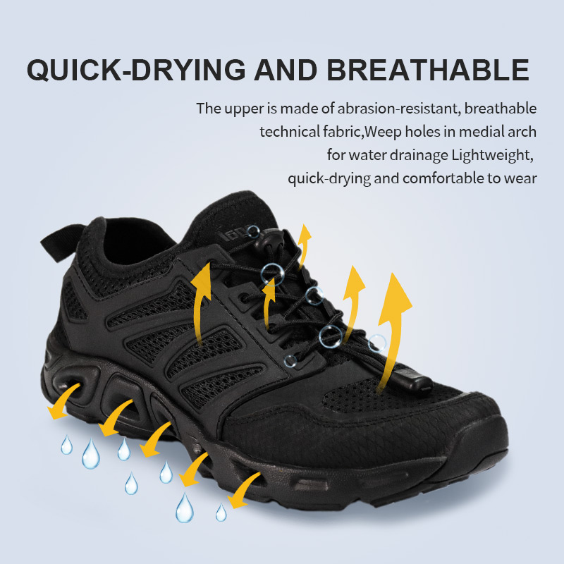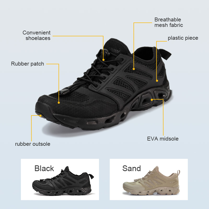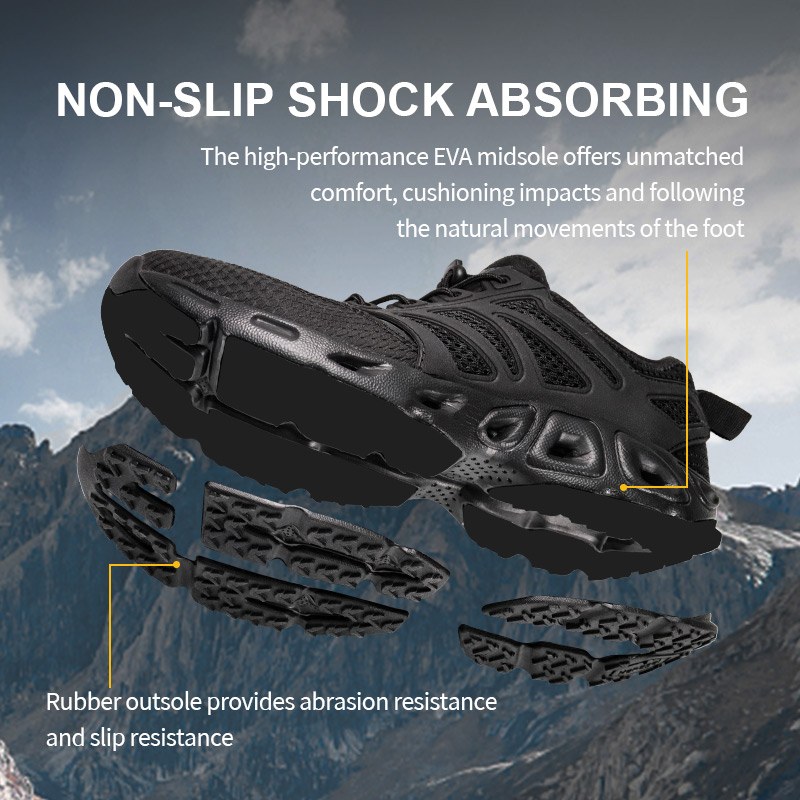 EVA Concussus Absorbens Trekking Shoes aedificatur vestigio humido vel sicco. Siccantibus materiis et adficio portubus in fornice, fundit aquam ieiunans cum ab riuo ad cacumen itur. Flexilis calcaneum commissura comae in stabilitate, dum Eva midsola mollem, impulsum absorbens, solatium calcat liberat. Et squalentem foris Flexilis? Stringere petram, lutum, glaream solvere. Amphibium, agile est, et structum movere tecum.