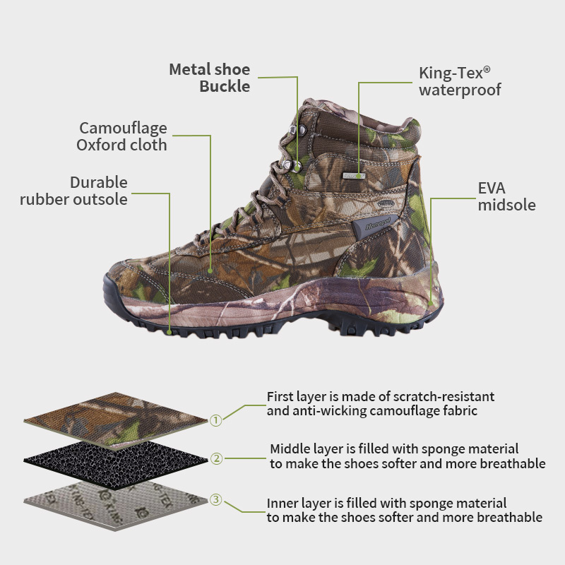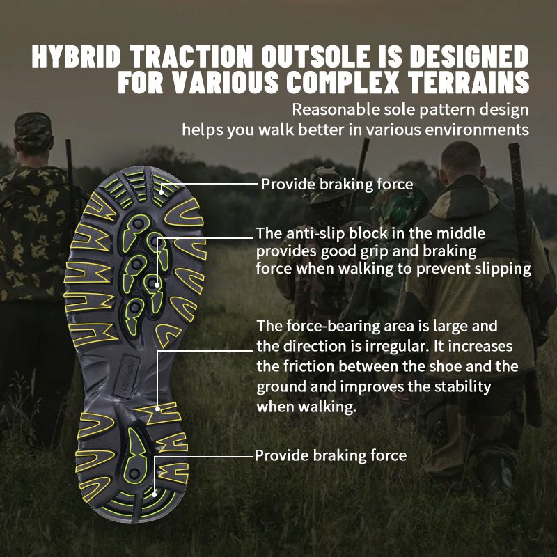① Poliyou summus tractus umor wicking insole intus siccum servat. EVA midsole, involutum in panno camouflage, cushion et offensa effusio. ③ Dura Flexilis foris, non-lapsus et obsistens.
