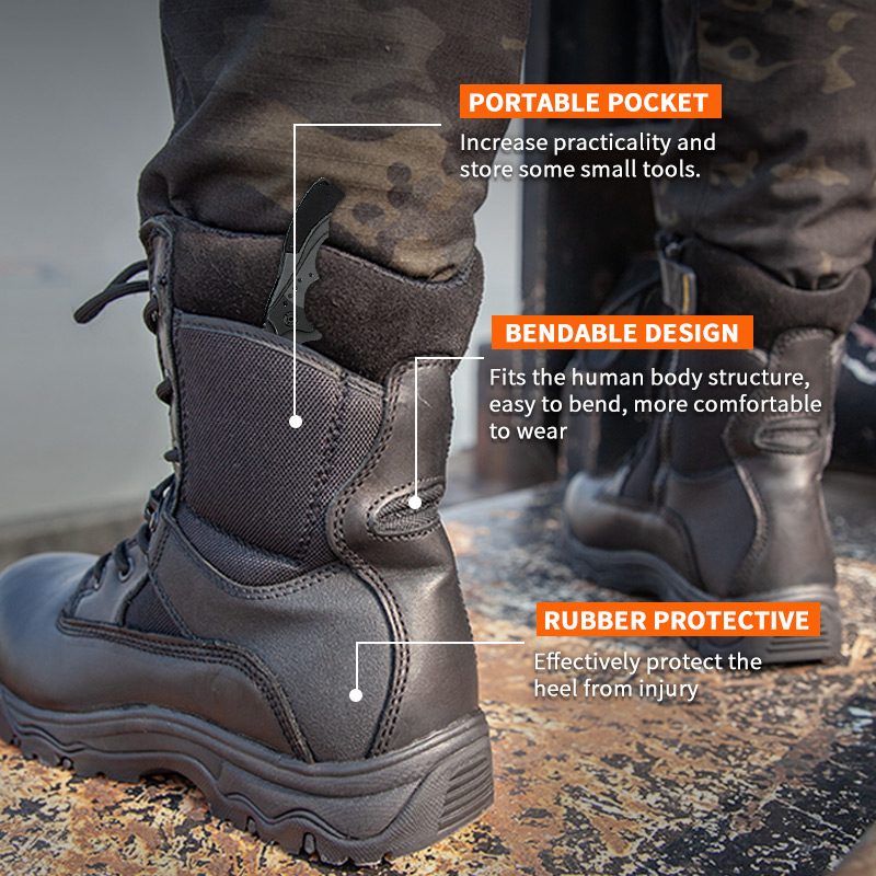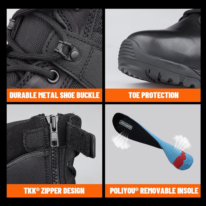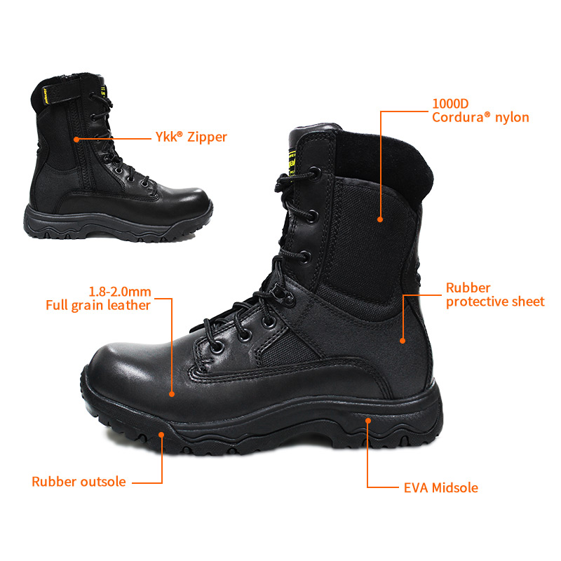 These YKK Zipper Full Grain Leather Police Boots are available for customization in color, material, and details, with MOQ of 800 pairs, ideal for brands collaborations and group procuration. Atque hae venationis commoda sequuntur;